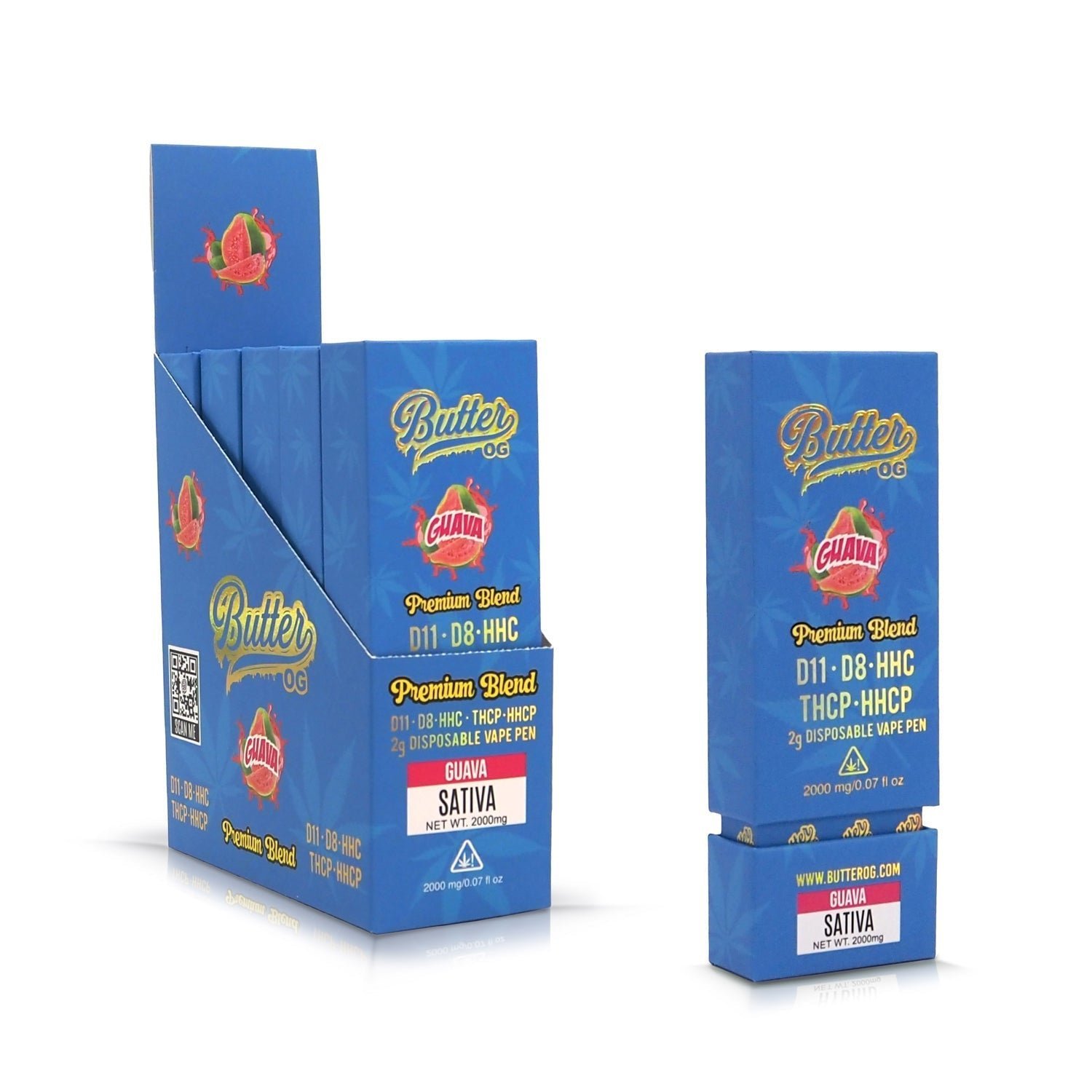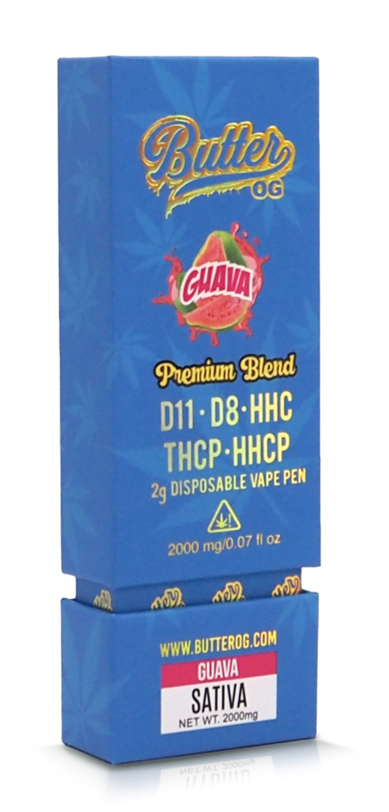 Elevate your vaping experience with the Butter OG Premium Blend Disposable Vape in Guava (Sativa), where powerful cannabinoids and tropical flavors meet in a sleek, user-friendly device.