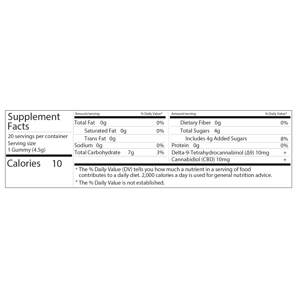 - 10mg of Delta 9 THC and 10mg of CBD each